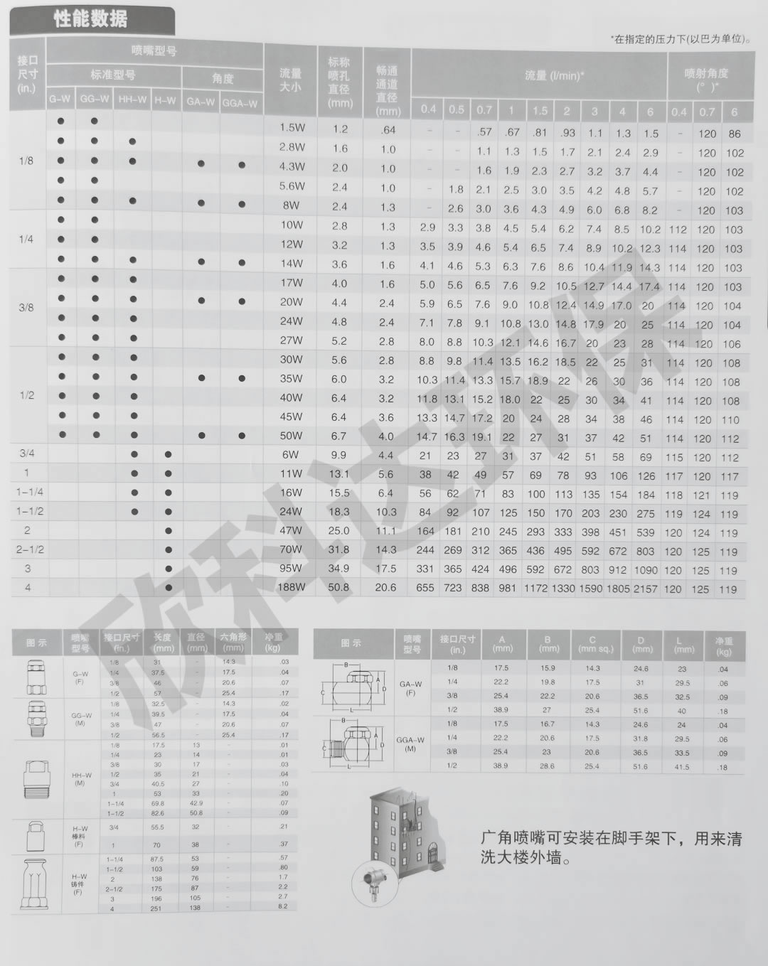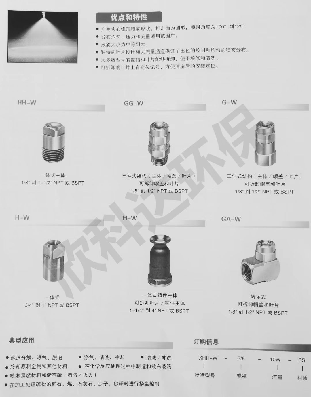 1.广角实心锥形喷雾形状,冲击面为圆形,喷射角度为100°到125°